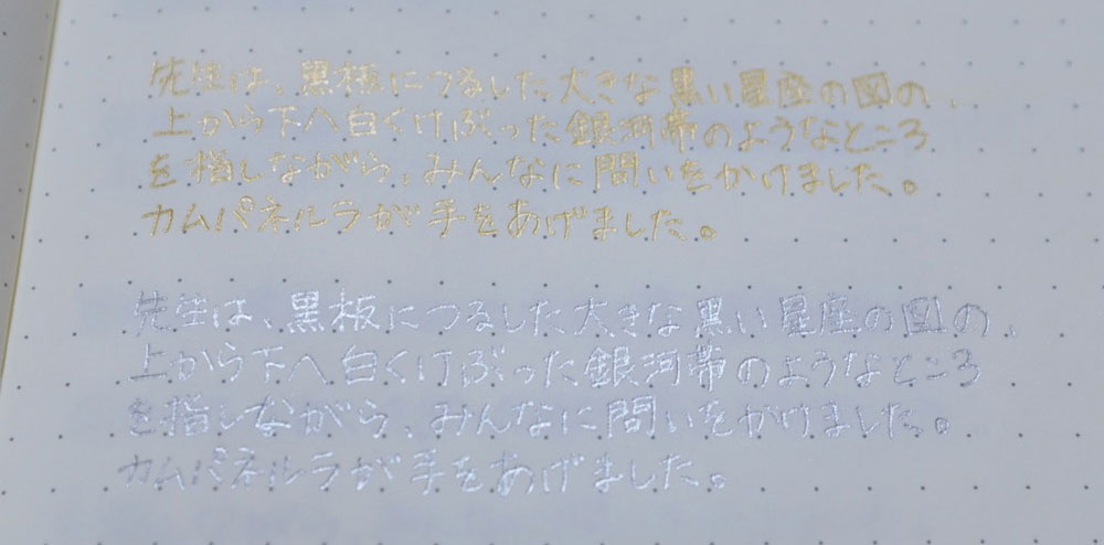 ゴールドとシルバーは白い紙に書いてもかなり発色が良いですね。とても細かいラメが入っているので、結構ギラギラしています。